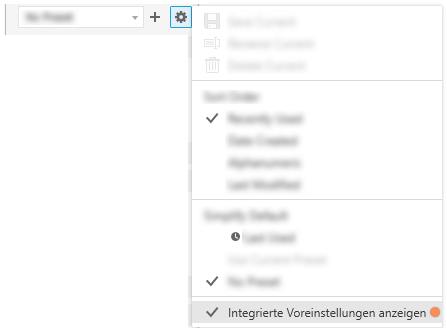 Ein Sternchen (*) neben einem Voreinstellungsname (Beispiel: *Voreinstellung 1) bedeutet, dass der Wert einer Elementdefinition im Vergleich mit der gespeicherten Version geändert wurde. Sie können die geänderte Voreinstellung über das Dropdown-Menü Einstellungen speichern und die vorherige Voreinstellung ersetzen, oder Sie verwenden