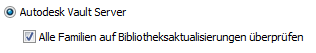 Wenn Sie über benutzerdefinierte Bibliotheken auf einem Vault-Server verfügen, deaktivieren Sie die Option Alle Familien auf Bibliotheksaktualisierungen überprüfen, um schnell alle Familien in benutzerdefinierten Bibliotheken von der Synchronisierung mit ihren übergeordneten Bibliotheken auf dem Vault-Server auszuschließen.