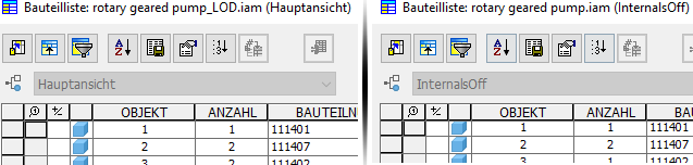 Die Bauteilliste für einen Modellzustand, der aus einer migrierten Nicht-Hauptdetailgenauigkeit erstellt wurde, verwendet die Stückliste des Hauptmodellzustands. Die Bauteilliste für ein Ersatzobjekt, das aus einem migrierten Detailgenauigkeits-Ersatzobjekt erstellt wurde, verwendet ebenfalls die Stückliste des Hauptmodellzustands. Für die Bauteilliste eines Ersatzobjekts wird die Modellzustands-Stückliste der Quellbaugruppe verwendet.