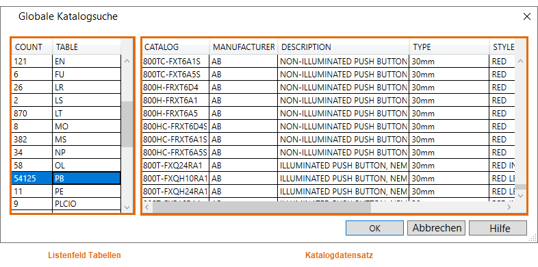 Anmerkung: Unterbaugruppenelemente, die durch einen Wert für BAUGRUPPENLISTE definiert sind, werden in die Suchergebnisse einbezogen. Die globalen Suchergebnisse basieren auf den Datensätzen der Spalten Katalog, Hersteller und Baugruppencode.