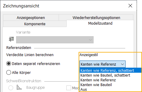 Das Dialogfeld Zeichnungsansicht wurde verbessert, sodass Sie nun schattierte Ansichten der referenzierten Bauteile erstellen können. Der Abschnitt mit den Linienstileinstellungen wurde in Anzeigestil umbenannt und wie folgt aktualisiert: