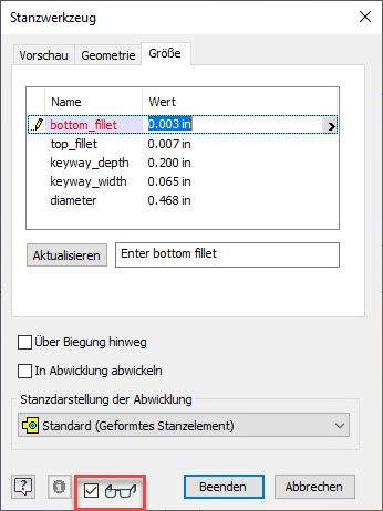 Sie können jetzt mit dem neuen Vorschau-Steuerelement, das dem Dialogfeld Stanzwerkzeug hinzugefügt wurde, steuern, ob die Vorschau berechnet wird oder nicht. Die Vorschau wird aktualisiert, wenn Sie beispielsweise die Auswahl von Punkten aufheben oder Werte ändern.