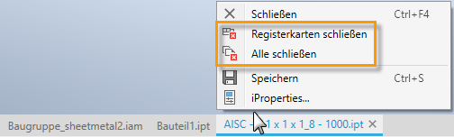 Verwenden Sie die neuen Kontextmenü-Optionen Registerkarten schließen und Alle schließen, um alle geöffneten Dokumente schnell zu schließen. Sie können auf die neuen Optionen über das Kontextmenü einer geöffneten Registerkarte zugreifen.