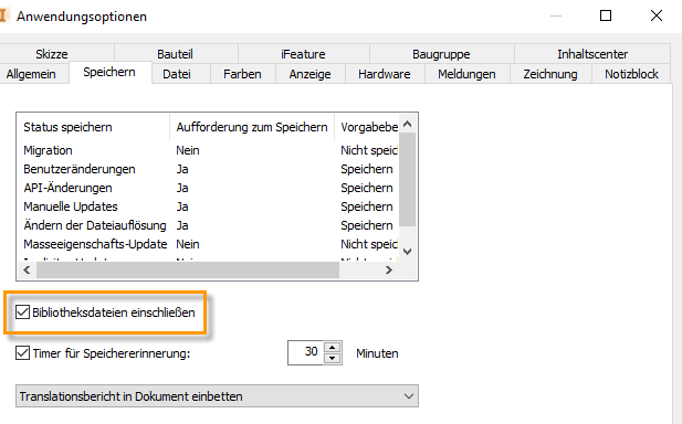 Zur Verdeutlichung wird das Kontrollkästchen Dateien in Bibliotheksordnern speichern in Bibliotheksdateien einschließen umbenannt. Im Allgemeinen können Sie auf der Registerkarte Speichern die Art der Änderungen steuern, für die Sie zum Speichern aufgefordert werden. Die Einstellung Bibliotheksdateien einschließen ermöglicht es Ihnen, zu steuern, ob Bibliotheksdateien aus der Eingabeaufforderung eingeschlossen werden sollen.