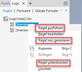 Es ist jetzt möglich, die Tastaturkürzel für die iLogic-Regeln im Kontextmenü zu verwenden. Wählen Sie die Regel in der Liste aus, klicken Sie mit der rechten Maustaste, und verwenden Sie das Tastaturkürzel, um den gewünschten Vorgang auszuführen. Die folgenden Tastaturkürzel sind verfügbar:
