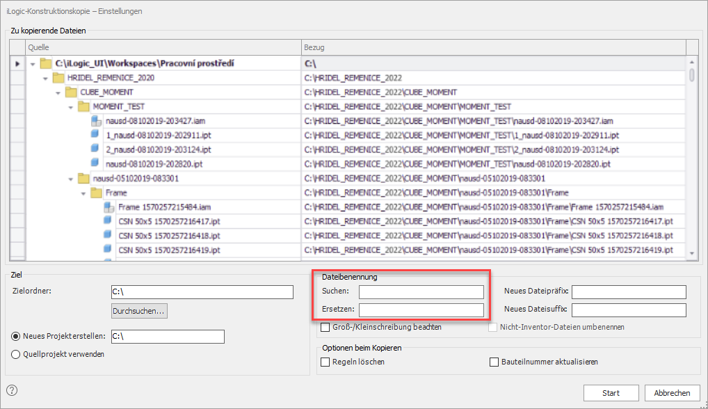 Sie können nun Dateinamen ändern, indem Sie die neu hinzugefügten Bearbeitungsfelder Suchen und Ersetzen im Dialogfeld iLogic-Konstruktionskopie verwenden.