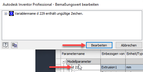 Wenn der Name eines Parameters ungültig ist (z. B. aufgrund von Leerzeichen oder Kommas), enthält das Warndialogfeld jetzt eine Bearbeitungsschaltfläche, mit der Sie den Namen direkt korrigieren können. Bisher konnten Sie die Änderungen nur verwerfen und von vorn beginnen.