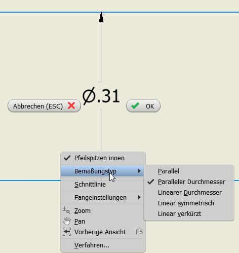 Wenn Sie die Sichtkante eines zylindrischen Elements (Welle oder Bohrung) auswählen, wird ein neue Bemaßungstyp für parallele Durchmesser mit einem Ø-Symbol erstellt.