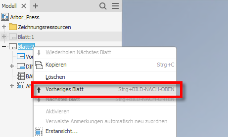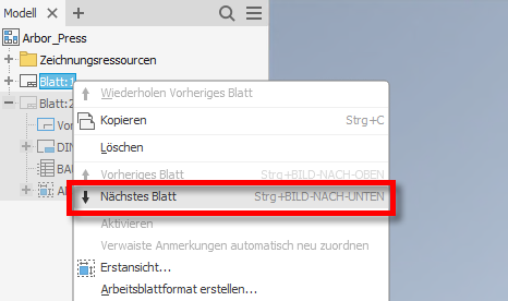 In früheren Versionen von Inventor mussten Sie auf das Blatt doppelklicken, um es zu aktivieren. Sie können jetzt mit den Befehlen Nächstes Blatt oder Vorheriges Blatt, ausgehend vom ausgewählten Blatt, mehrere Blätter in einer Zeichnung durchsuchen. Sie können diesen Befehlen bei Bedarf die Tastaturkürzel zuweisen.
