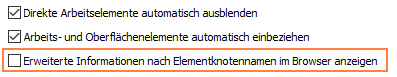 Die Optionen Erweiterte Informationen nach Elementknotennamen im Browser anzeigen (verfügbar unter Anwendungsoptionen > Registerkarte Bauteil) und Erweiterte Namen anzeigen (verfügbar im Menü des Modell-Browser-Werkzeugs) wurden verbessert. Sie unterstützen nun auch die folgenden Befehle:
