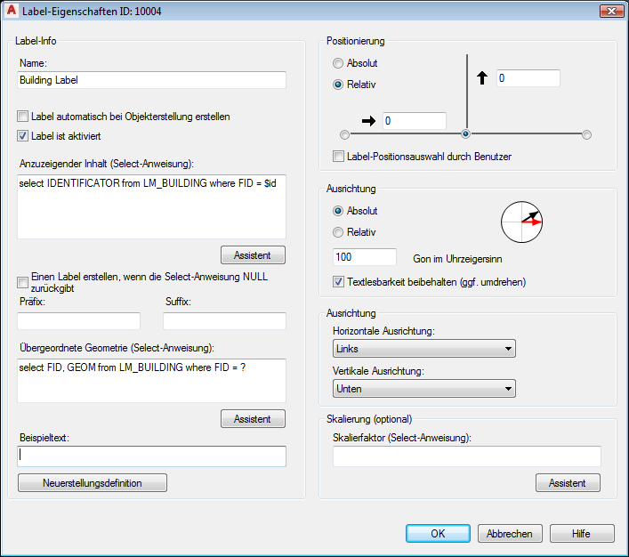 Labeleigenschaften legen fest, wie der Labeltext aus der Datenbank ausgewählt wird und wie das Label positioniert wird.