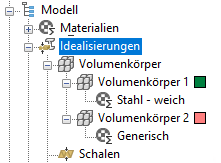 Erweitern Sie in der Modellstruktur die Idealisierungen. Wenn Idealisierungen bereits definiert sind, z. B. die untenstehenden Körper 1 und 2, klicken Sie mit der rechten Maustaste auf , um sicherzustellen, dass keine unerwünschten Materialien in der Analyse berücksichtigt werden.