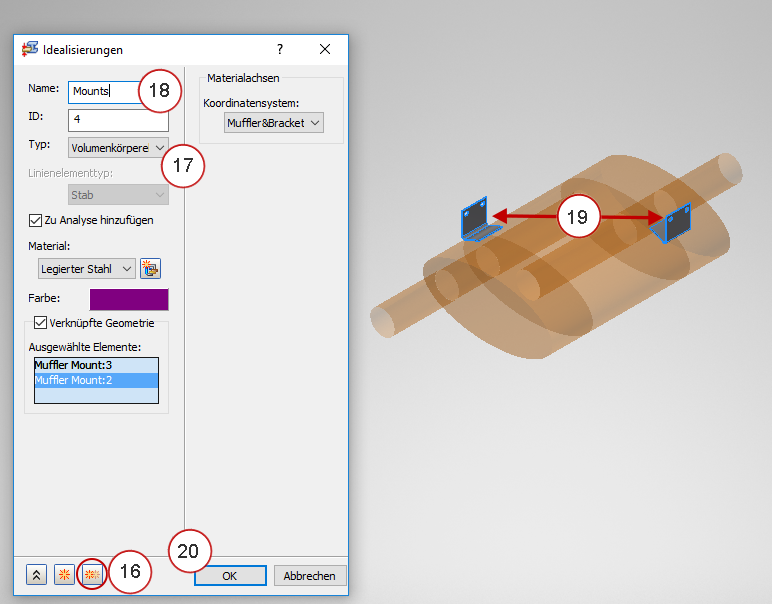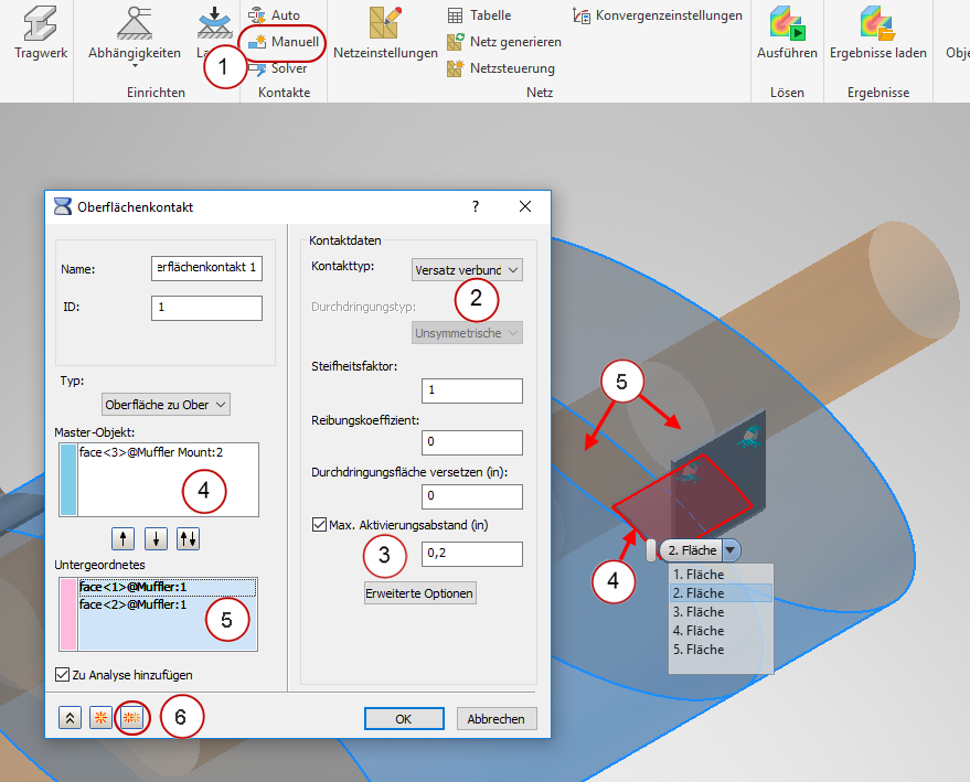 - Klicken Sie in das Feld Sekundäres Objekt und wählen Sie die beiden angrenzenden Flächen des Schalldämpfers aus, die das Befestigungsteil berühren.