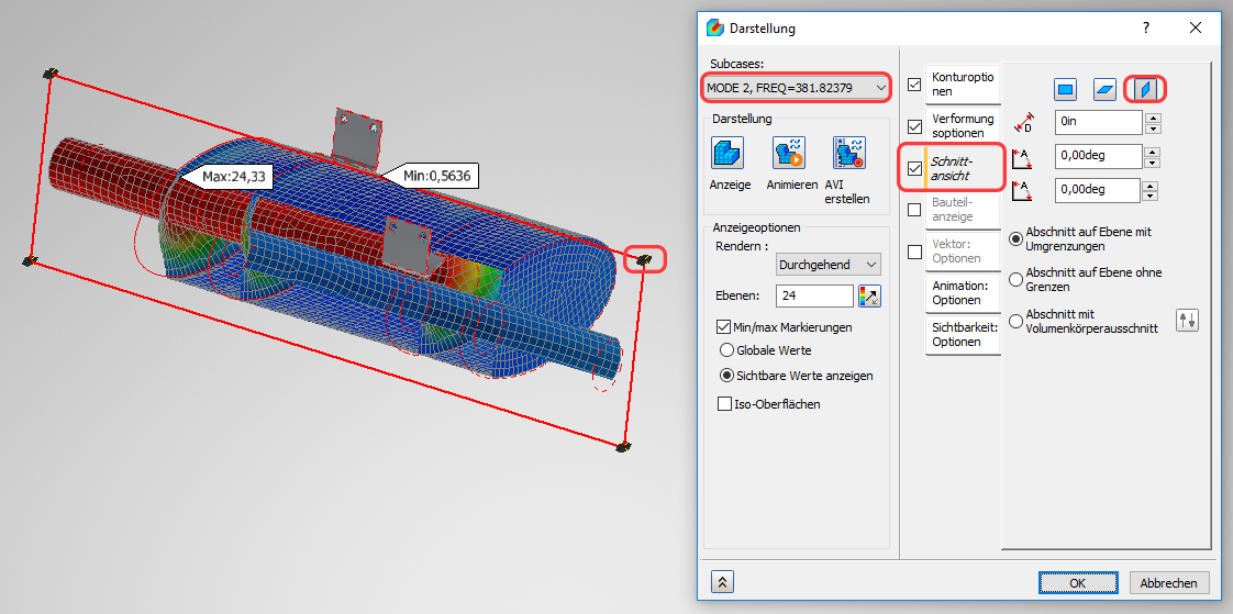 - MODUS 2: Hohe Eingangsenergie in Längsrichtung. Die tonnenförmigen Ausbauchungen von Endplatten und Schotten sind durch die Längsschwingung eindeutig gefährdet. Um eine Schnittansicht zu verwenden, wählen Sie die Registerkarte Schnittansicht und wählen Sie die Ausrichtung. Ziehen Sie die Schnittebene mithilfe der Griffe.