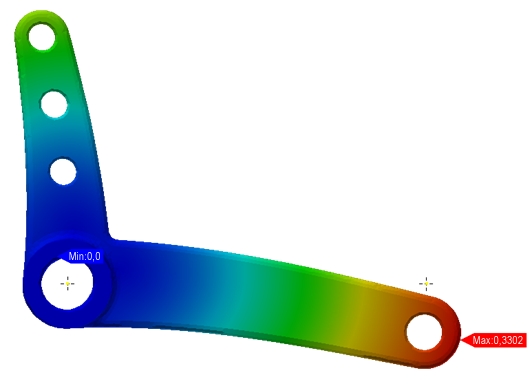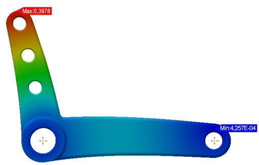 In der vierten Übung haben wir de Abhängigkeiten durch die tatsächlichen Stifte ersetzt, Symmetrie zur Beschränkung der Starrkörperbewegung eingesetzt und die Interaktion und Bewegung zwischen Hebelarm und Stiften mithilfe von Kontakten modelliert. Mit dieser Kombination von Techniken haben wir ein physikalisch höchst realistisches Analyseszenario erstellt und die resultierende Verformung ermittelt:
