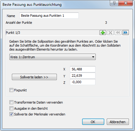 Standardmäßig werden die Sollkoordinaten des Punkts in den X-, Y- und Z-Feldern angezeigt. Wenn Sie die Sollwerte jedes Punkts manuell eingeben möchten, wählen Sie das Kontrollkästchen Sollwerte der Merkmale automatisch verwenden ab, und geben Sie die Koordinaten manuell ein.