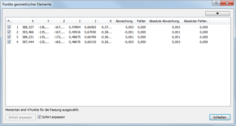 - Doppelklicken Sie auf Gemessene Punkte. Der Dialog Punkte geometrischer Elemente wird angezeigt, der die Details der gemessenen Punkte angibt.