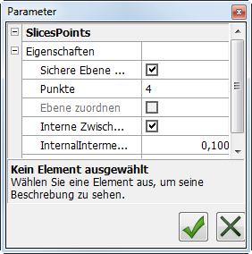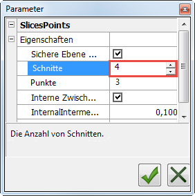 Jedes Messverfahren enthält mehrere Parameter, die die Anzahl der gemessenen Punkte bestimmen, die zur Messung eines Elements erforderlich sind, die Anzahl der Schnitte im Tasterpfad, und so weiter. Verwenden Sie den Parameter-Dialog, um die Standardwerte für die aktuell ausgewählte Methode anzusehen oder zu ändern.
