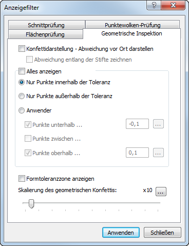 Wenn Sie die Anzeige der gemessenen Punkte von geometrischen Merkmalen in der CAD-Ansicht filtern möchten, klicken Sie auf Ansicht-Registerkarte > Ansichtsoptionen-Gruppe > Anzeigefilter und wählen die Geometrische Inspektion-Registerkarte aus.