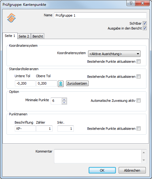 Option - Geben Sie die Minimalen Punkte ein, die benötigt werden, um das Merkmal zu messen. Die Gruppe wird solange als ungemessen behandelt, bis zumindest die festgelegte Anzahl von Punkten gemessen ist. Wählen Sie Automatisch Annehmen aktiv aus, um die Punkte zu speichern, sobald Sie die vorgegebene Anzahl von Punkten gemessen haben. Diese Einstellung hat keine Auswirkung, wenn Sie einen Tasterpfad für die Gruppe festlegen.