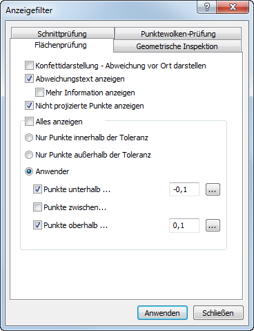 - Anwender, um die unteren und oberen Grenzwerte für die anzuzeigenden Punkte festzulegen. Wählen Sie das Kontrollkästchen Punkte unter aus, um Punkte unter der angegebenen unteren Toleranzgrenze anzuzeigen. Wählen Sie das Kontrollkästchen Punkte über aus, um Punkte über der angegebenen oberen Toleranzgrenze anzuzeigen. Wählen Sie das Kontrollkästchen Punkte zwischen aus, um Punkte zwischen den angegebenen oberen und unteren Toleranzgrenzen anzuzeigen.