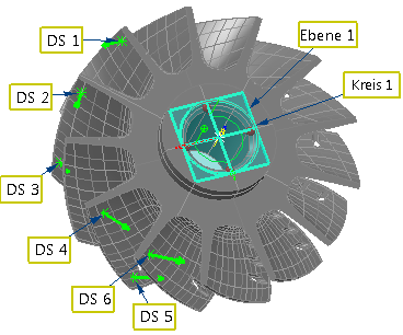 Wenn Sie nur einige der Achsen eines Teils mit geometrischen Elementen sperren können, können Sie mithilfe einer Mischung aus geometrischen Elementen und geführten Prüfpunkten eine RPS-Ausrichtung erstellen. Die geometrischen Elemente werden verwendet, um ausgewählte Achsen zu sperren, und die Punkte werden dann verwendet, um die verbleibenden Bedingungen zu erstellen. Das folgende Beispiel zeigt, wie mithilfe eines Kreises und von Prüfpunkten, die um die Blätter eines Impellers angeordnet sind, eine RPS-Ausrichtung erstellt werden kann.