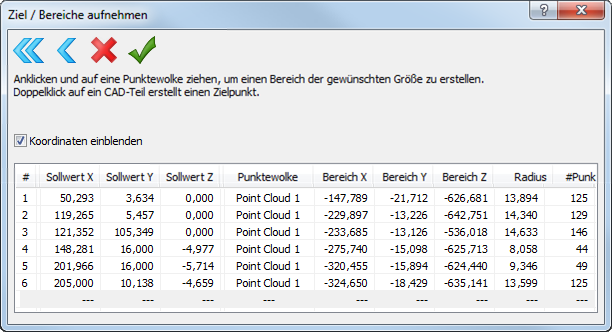Der Ziel / Bereiche aufnehmen-Dialog wird angezeigt, wenn Sie auf Hinzufügen oder Modifizieren im Ausrichtung mit gewählten Punkte aus Punktewolke-Dialog klicken. Verwenden Sie diesen, um Punkte auf dem CAD-Modell Bereichen in Punktewolken zuzuordnen, wenn Sie eine Ausrichtung mit gewählten Punkten aus Punktewolke erstellen. Zum Beispiel: