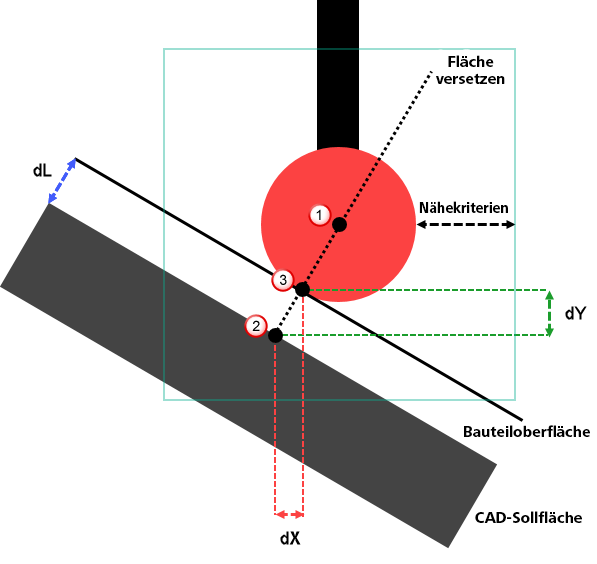 Der Kontaktpunkt auf der Fläche des Teils. Dieser wird ermittelt, indem der Tastnadel-Radius entlang der Flächennormalen projiziert wird. PowerInspect verwendet diesen Punkt, um die Abweichungen (dL, dX und dY) zwischen der Modellfläche und der Teilfläche zu berechnen.