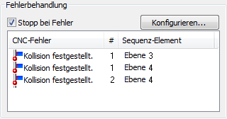 Die Fehlerbehandlung-Liste enthält die von PowerInspect erkannten Fehler. Jeder Eintrag benennt den Fehlertyp, die Anzahl der Fehler in der Bewegung sowie das Sequenzelement, in dem der Fehler aufgetreten ist. Zum Beispiel: