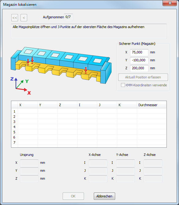 Prüfen Sie das Magazin, um dessen Position auf dem Messgerät zu ermitteln, und erstellen Sie ein Magazin-Koordinatensystem relativ zum Maschinen-Koordinatensystem.