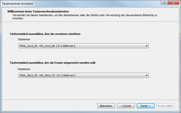 - Wenn Sie ein Dokument zur Verwendung auf CNC-Maschinen bearbeiten, werden Sie im Tasterwechsel-Assistenten aufgefordert, den Typ der Änderung auszuwählen, die Sie durchführen möchten. Wählen Sie Tastersensor wechseln aus, und klicken Sie auf Weiter, um den Sensor anzugeben, den Sie ersetzen möchten.