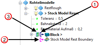 Um ein Rohteilmodell in einem Projekt zu verwenden, erstellen Sie zunächst ein Rohteilmodell-Element und wenden dann einen Block, gefolgt von verschiedenen Werkzeugwegen an. Nach jeder Aktualisierung wird das Rohteilmodell angepasst und zeigt das unbearbeitete Material an, das vom Block übriggelassen wurde.