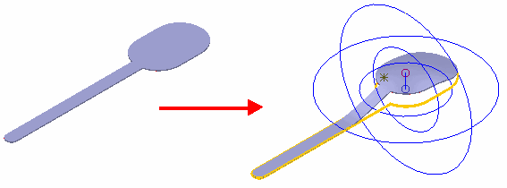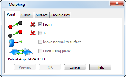Wenn Sie den Morph erstellen, wird die durch die Verformung generierte Ausbauchung auf dem Ursprungspunkt zentriert. Die Höhe und Richtung der Ausbauchung werden von dem Abstand zwischen dem Ursprungspunkt und dem Verformungspunkt bestimmt.