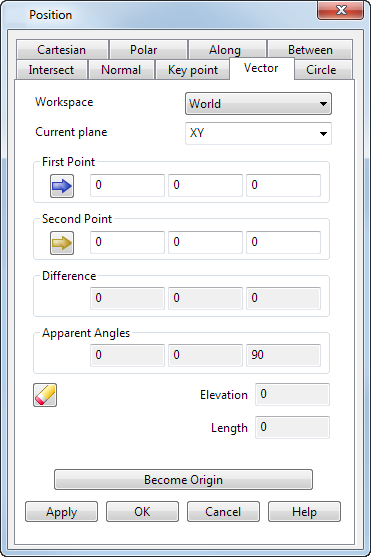 Verwenden Sie die Vektor-Registerkarte im Dialogfeld Position, um einen Vektor zwischen zwei Punkten zu messen und eine Position zu definieren. Die Unterschiede, Scheinwinkel, Länge und Höhenwinkel zwischen den beiden Punkten werden angezeigt.