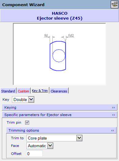 Auf der Key & Trim-Registerkarte werden die Parameter für die eingegebenen Stifte mit einfacher und doppelter Nut angezeigt, die für einfache, abgestufte Schaufelauswerferstifte und Auswerferhülsen verfügbar sind. Die angezeigten Parameter sind für die Art der Komponente, die Sie erstellen, spezifisch.
