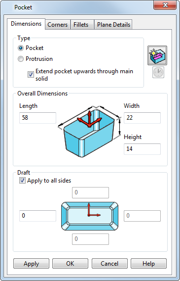 Verwenden Sie die Abmessungen-Registerkarte , um die Abmessungen der Tasche oder des Vorsprungs anzugeben.