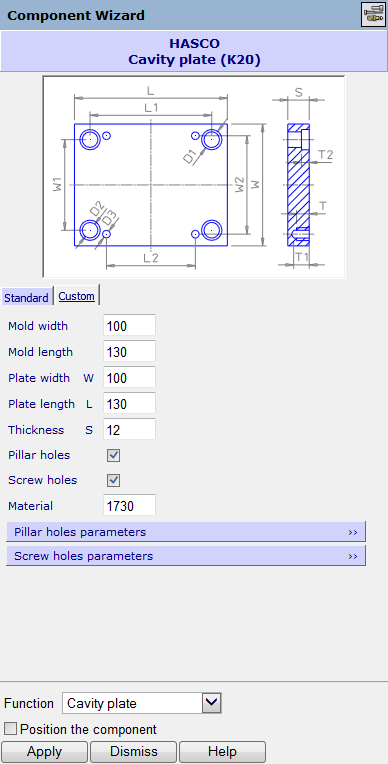 Verwenden Sie Optionen wie Plattenbreite, Plattenlänge und Stärke, um die Abmessungen zu ändern. Die genauen Parameter, die auf der Benutzerdefiniert-Registerkarte angezeigt werden, spiegeln den Komponententyp wider, den Sie definieren.