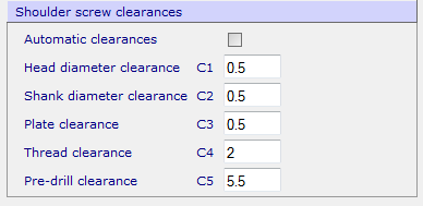 Auf der Freimachungen-Registerkarte werden die Parameter angezeigt, die für Komponenten wie Führungssäulen, Auswerferstifte, Schrauben, Angussbuchsen, Stützsäulen und Passungen erforderlich sind. Die angezeigten Parameter sind für die Art der Komponente, die Sie erstellen, spezifisch.