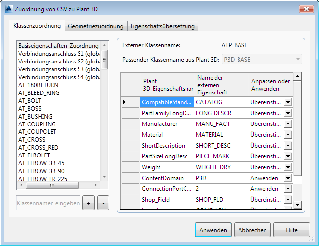 Ordnet Drittanbieter-Klasseneigenschaften Plant 3D-Entsprechungen zu.