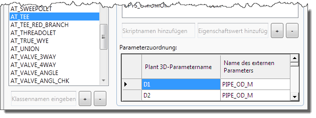 Sie können diese Parameter in der Zuordnungstabelle in die Spalte Plant 3D-Parametername eingeben und sie dem entsprechenden AutoPLANT-Eigenschaftsnamen (oder -wert) zuordnen.