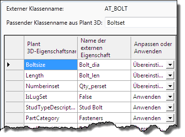 Die Schraubendurchmesser-Eigenschaft AT-BOLT von AutoPLANT wird der Plant 3D-Eigenschaft Schraubengröße zugeordnet bzw. an sie angepasst. Der Plant 3D-Wert Verbindungsteile wird dagegen auf die Eigenschaft Teilekategorie angewendet. In diesem Beispiel wird Schraubendurchmesser als Eigenschaft angepasst, Verbindungsteile wird jedoch als Eigenschaftswert angewendet.