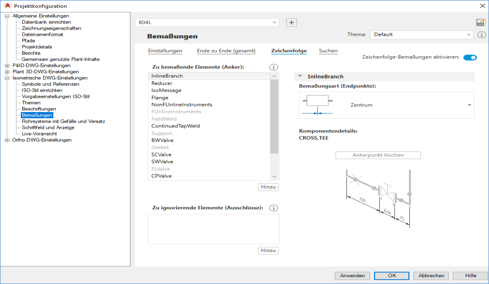 Das Dialogfeld Projektkonfiguration wurde überarbeitet und enthält nun erweiterte Funktionen für die isometrische Bemaßung. Bei der Einrichtung der isometrischen Bemaßung können Sie außerdem auf den ISO-Stil-Editor zugreifen und die erweiterte Konfiguration der Datei IsoConfig.xml vornehmen.