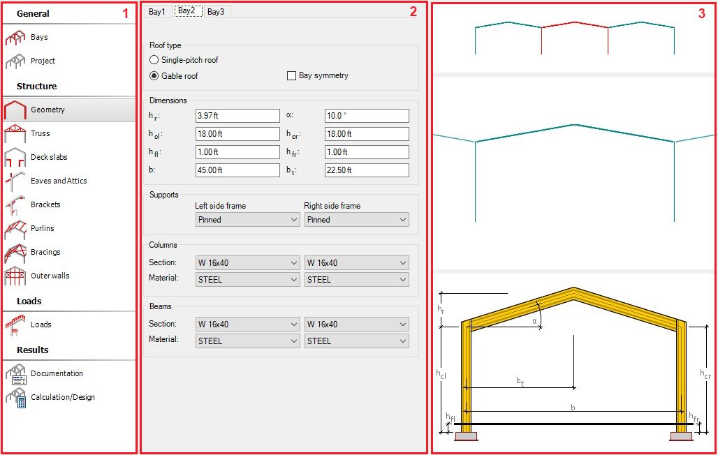 - Im rechten Teil finden Sie den grafischen Viewer, der in drei Teile unterteilt ist und die definierten Elemente der Rahmenkonstruktion anzeigt.