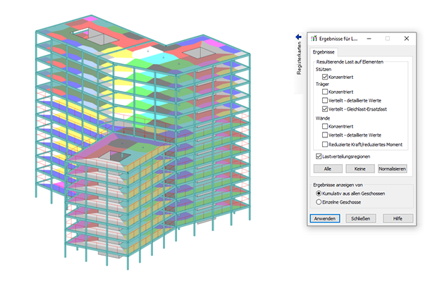 - Übertragen von Lasten auf einzelne Objekte, sodass eine objektbasierte Normbemessung mit herkömmlichen, praktischen Bemessungsnormwerkzeugen oder sogar mit Tabellen möglich ist