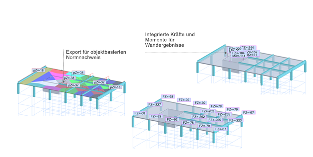 - Interne Kräfte in Trägern und Stützen, die auf ermittelten resultierenden Lasten basieren und in internen Bemessungsmodulen verwendet werden können