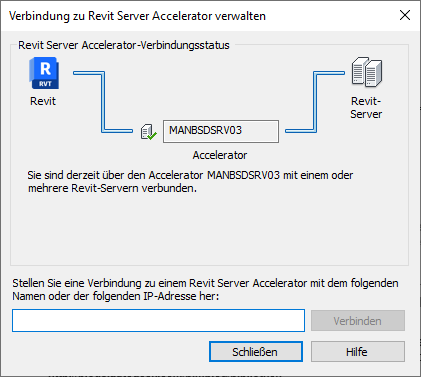 Gehen Sie wie folgt vor, um den Status der Verbindung mit dem für Ihren Standort zugewiesenen Accelerator (mithilfe der Umgebungsvariablen RSACCELERATOR2023 Release Ihres Systems) zu prüfen und bei Bedarf einen anderen Accelerator anzugeben. Wenn Ihre Netzwerkverbindung zum Revit Server Accelerator unterbrochen wird oder Sie entscheiden, ihn nicht zu verwenden, werden Sie direkt mit den Revit Servern verbunden.