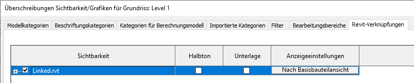 Wenn Nach Basisbauteilansicht nicht angezeigt wird, klicken Sie in die Spalte Anzeigeeinstellungen. Wählen Sie im Dialogfeld Anzeigeeinstellungen für RVT-Verknüpfungen auf der Registerkarte Grundfunktionen die Option Nach Basisbauteilansicht, und klicken Sie auf OK.