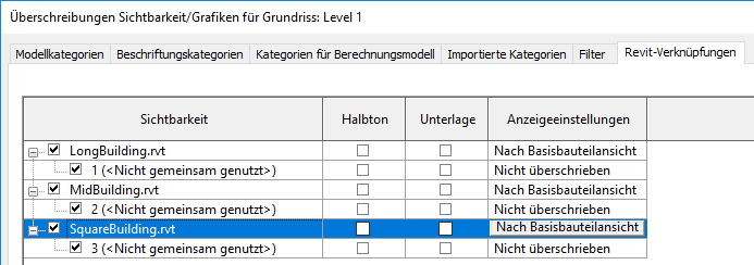 Die Registerkarte Revit-Verknüpfungen im Dialogfeld Sichtbarkeit/Grafiken enthält die folgenden Spalten: