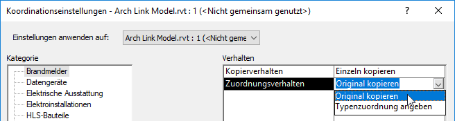 Geben Sie vor oder beim Kopieren von Installationen aus einem verknüpften Modell in ein MEP-Modell für jede Installationskategorie im Dialogfeld Angeben von Koordinationseinstellungen ein Zuordnungsverhalten an.