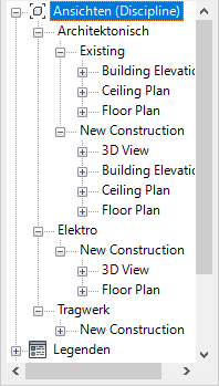 So können Sie beispielsweise Ansichten nach Disziplin, Phase und Ansichtstyp ordnen. Darüber hinaus können auch Pläne und Bauteillisten/Mengen im Projektbrowser geordnet werden.